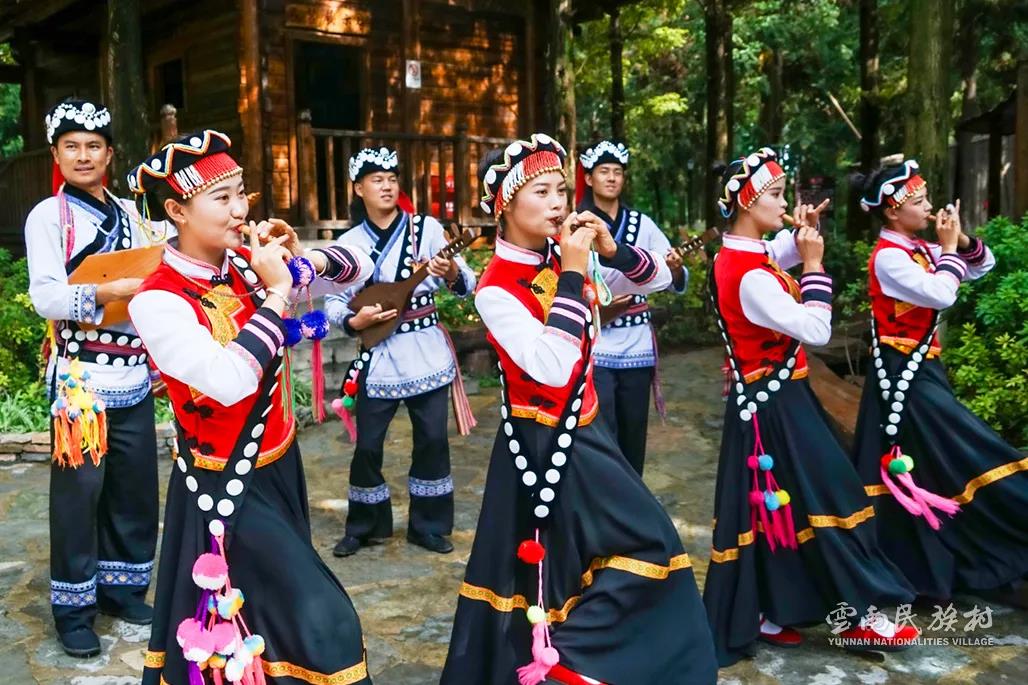 彝族在云南境內約471萬人,是省內人口最多、分布最廣的少數(shù)民族,主要聚居在金沙江、元江流域和哀牢山、無量山腹地。彝族是一個能歌善舞的民族,民間打歌、跳樂之風盛行,大三弦、跌腳舞久負盛名。火把節(jié)是彝族最具特色的民族節(jié)日。彝族村占地50余畝,三虎浮雕墻與虎頭內祖師形象表現(xiàn)了彝族虎鷹文化。太陽歷廣場圖騰柱上有太陽、虎、火和八卦圖形象,周圍環(huán)繞著10個朝向不同的月球造型,外圓周有12生肖石雕。依山而建的“...